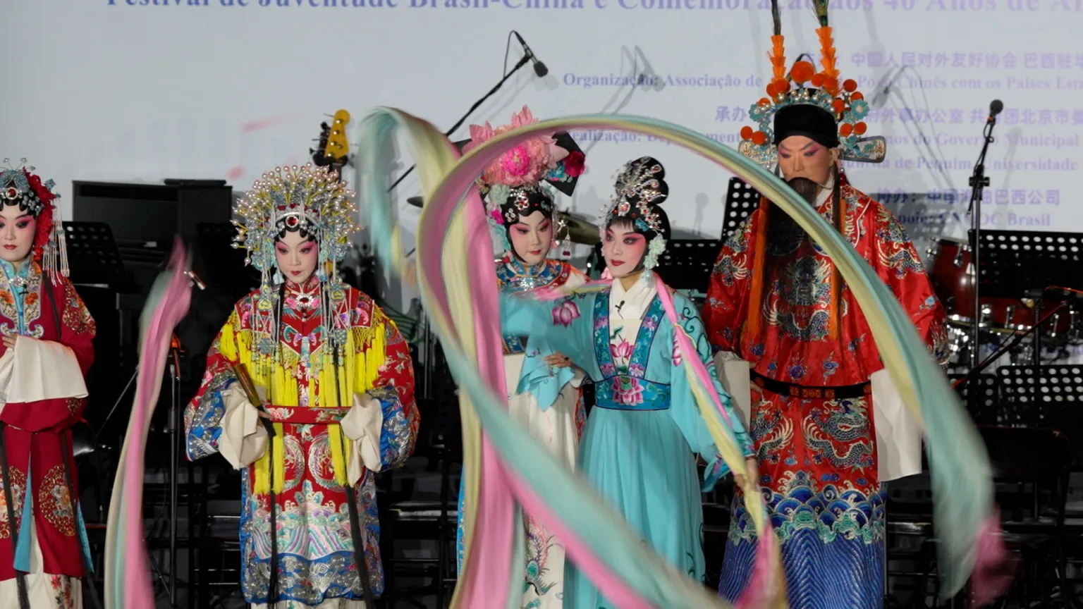 Um dos momentos centrais da noite foi a apresentação do grupo artístico da Universidade Renmin com trechos da ópera de Pequim, uma das expressões mais tradicionais do teatro musical chinês, marcada pela combinação de música, dança e interpretação cênica altamente codificada.