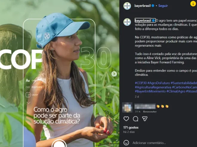 Postagem da Bayer, produtora de agrotóxicos, sobre a COP30 (Foto: Reprodução)