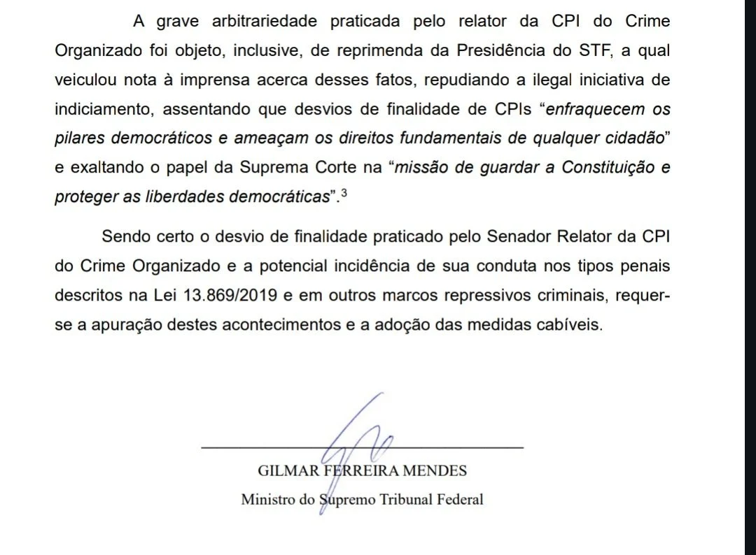 Em ofício, Gilmar Mendes sustenta que houve “grave arbitrariedade” na condução do relatório e afirma que a própria Presidência do STF já havia se manifestado sobre o caso, “repudiando a ilegal iniciativa de indiciamento”. No documento, o ministro destaca que desvios de finalidade em CPIs “enfraquecem os pilares democráticos e ameaçam os direitos fundamentais de qualquer cidadão”.