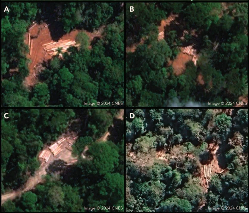 Via imagens de satélite, a EIA identificou uma operação de extração ilegal de madeira em grande escala no Território Indígena Munduruku entre 2023 e 2024. (Reprodução/Imagens de satélite fornecidas por CNES; mapa e localizações identificados pela EIA)