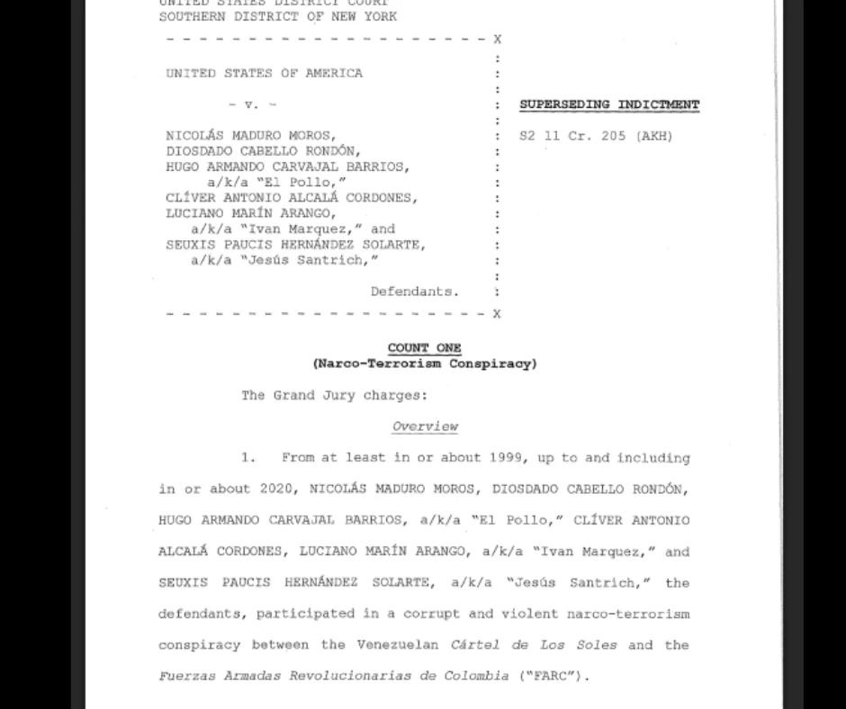 Maduro, segundo os americanos, teria “coordenado com as FARC para promover a conspiração narcoterrorista a fim de: transportar e distribuir esses grandes carregamentos de cocaína; Beneficiar-se e induzir outros a participar do fornecimento de segurança fortemente armada para proteger os carregamentos de cocaína”.