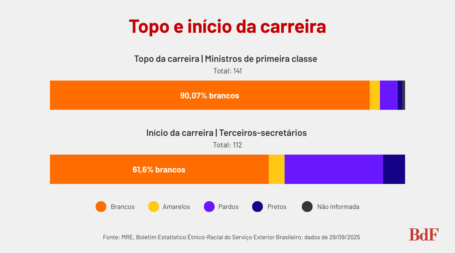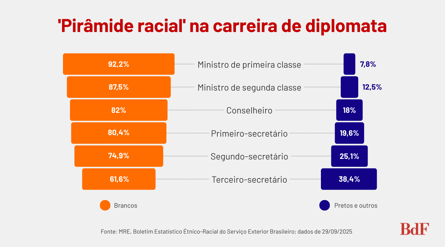 Apesar de negros representarem 55,5% da população brasileira, segundo o Censo 2022, eles ocupam apenas 15,7% da carreira diplomática do país. No topo dessa estrutura, a disparidade é ainda mais acentuada: entre os postos de chefia no exterior – como embaixadas, consulados e missões –, apenas 4,9% eram chefiados por pessoas negras em setembro de 2025.