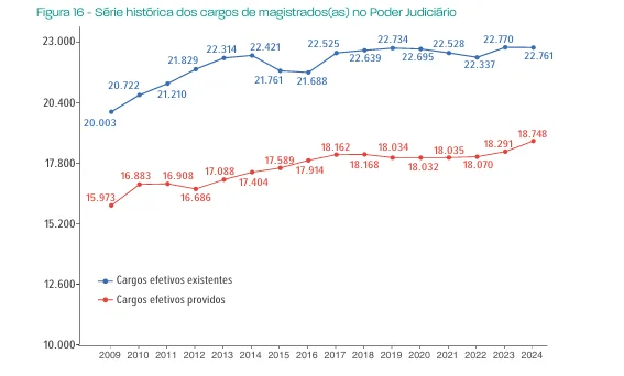 Linha histórica com o déficit de juízes registrados no período de 2009 a 2024 – Fonte: CNJ