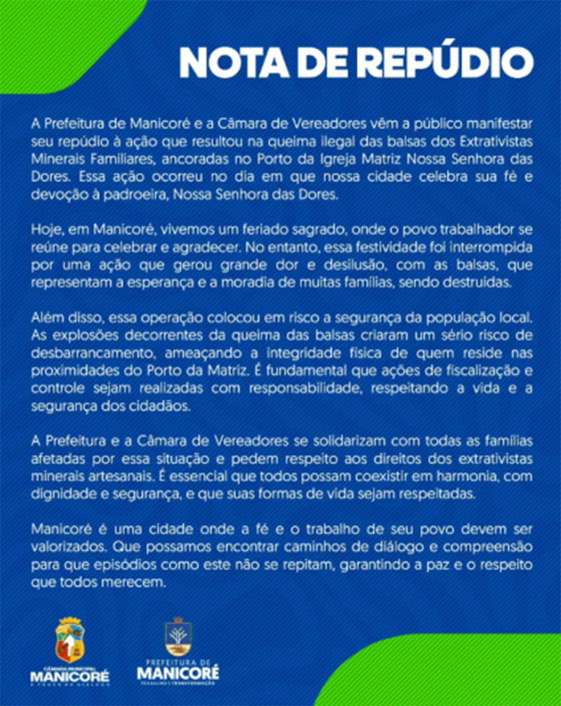 Em nota publicada no Instagram, o prefeito de Manicoré, Lúcio Flávio (PSD), se posicionou contra a ação da PF. O gestor repudiou a destruição das dragas e balsas, classificando os garimpeiros como “extrativistas minerais familiares”. Para ele, a operação prejudica trabalhadores locais que, segundo sua visão, buscam apenas sustento na atividade.