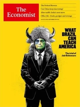A revista britânica The Economist trouxe Jair Bolsonaro na capa da edição desta semana. O ex-presidente aparece com o rosto pintado nas cores do Brasil e usando um chapéu semelhante ao do “viking do Capitólio”, figura da invasão ao Congresso dos Estados Unidos em 2021. O julgamento de Bolsonaro começa no próximo dia 2 de setembro no Supremo Tribunal Federal (STF) e deve se estender até 12 de setembro.