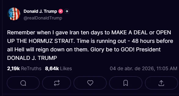 “Lembram quando dei ao Irã dez dias para FAZER UM ACORDO ou ABRIR O ESTREITO DE ORMIZ? O tempo está se esgotando. 48 horas antes que o inferno se abata sobre eles. Glória a DEUS! Presidente DONALD J. TRUMP.”