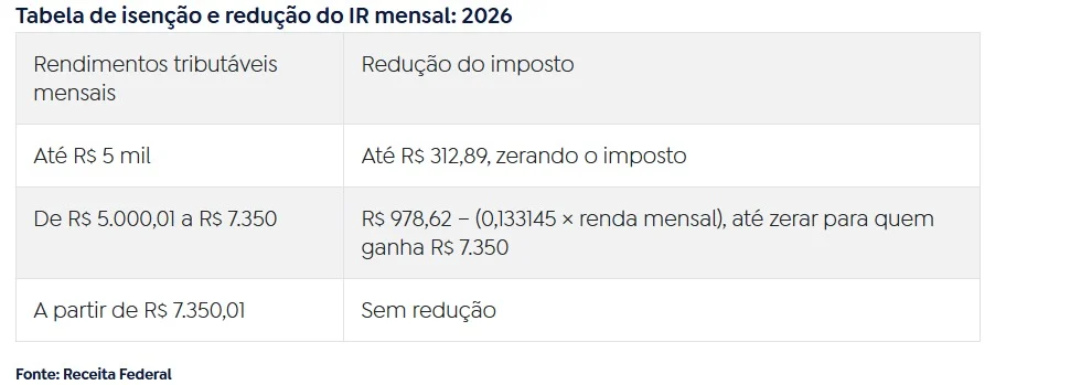 As alterações valem para os salários pagos a partir de janeiro, com impacto percebido a partir do pagamento de fevereiro. As mudanças se refletirão na Declaração do Imposto de Renda Pessoa Física de 2027, que considera os rendimentos de 2026.